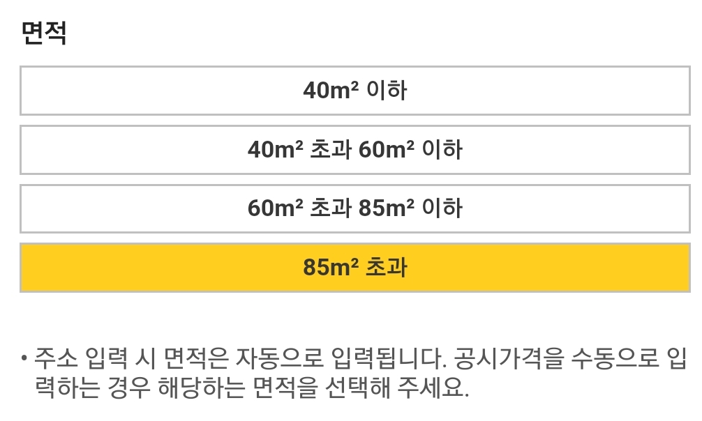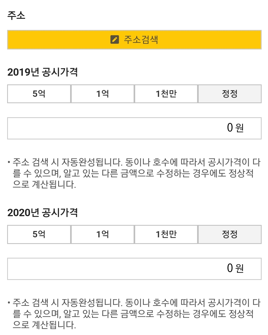 주소로 입력하면 자동으로 공시가격이 입력되는데