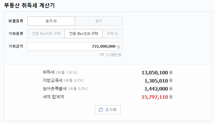저는 거래금액 7억 2,100만 원을 입력해줘봤습니다. 아래와 같이 계산이 되어 나오네요. 제 예상과는 다르게 거래금액 7억 2,000만 구간에는 1,81%가 적용되는군요. 6억 ~ 9억 사이 거래대금 구간에는 차등 비례세율이라 정확한 세율을 기억하기 어려워서 그렇습니다.