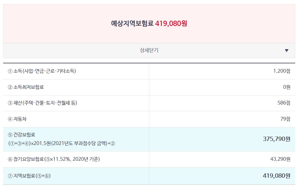 위에 2021년에 201점이라고 되어있죠? 그럼 1,859점 X 201점 = 37만 원 정도 나오네요. 이 수치가 제대로인지 한 번 국민건강보험공단에서 제공하는 지역의료보험계산기를 돌려보겠습니다.