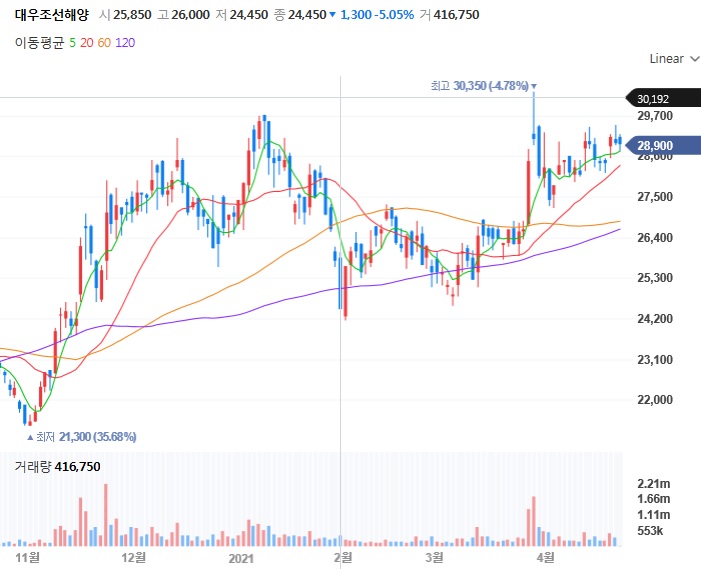이평선을 타고 상승중이네요. 근데 생각보다 대우조선해양은 차트로 보니 상승한게 없어서 조선주 사이에선 저평가 같네요.