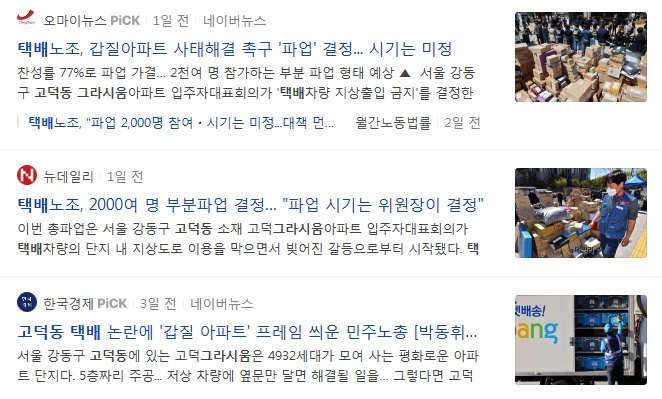 택배회사 쪽에서 지상 출입을 허가해달라, 뭐 이런식으로 주장하였고 이를 받아들이지 않은 아파트입대위에서 또 거절하면서 택배배송 거부라는 사태들이 발생하게 된거죠.