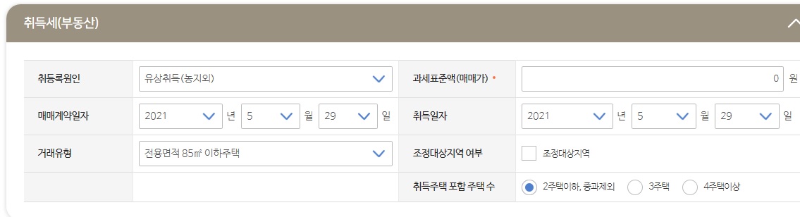 참고로 아파트는 유상취득(농지외)로 입력해야되며 조정대상지역 내 중과세 2주택 세율을 적용받는 대상이면 조정대상지역을 체크하고 2주택이라고 입력해줘야 합니다.