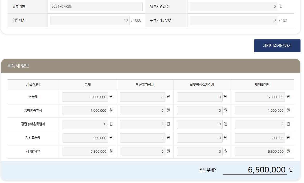 농어촌특별세도 전용면적 85m2 초과 답게 0.2%로 계산해서 총 납부세액 650만 원이 나왔네요. 이런식으로 쉽게 아파트 취등록세 계산기를 활용하실 수 있습니다.