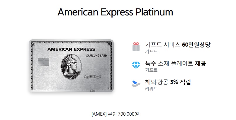 오늘의 주제인 아메리칸 익스프레스 플래티넘 입니다. 플래티넘의 연회비는 70만 원이고 가족카드로 발급시 15만 원, 삼성카드로 발급해도 70만 원 정도 합니다.