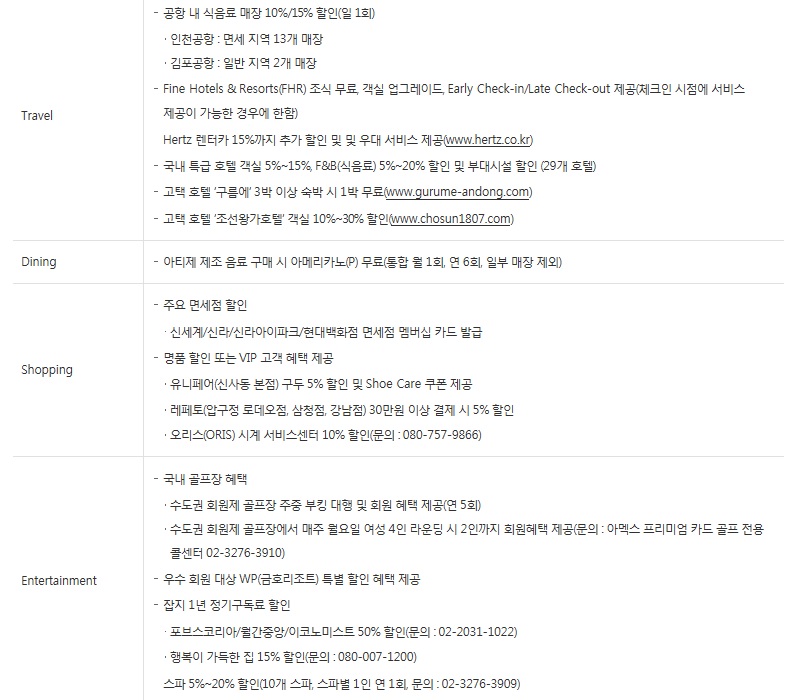 고급 호텔등 에서 총 25만 원 씩 연 2회 혜택과 추가 호텔 서비스로 객실이나 다이닝 서비스를 받을 수 있습니다. (서울 클럽앤 스파, 서울신라호텔, 서울웨스턴조선, 안다즈 서울강남, 파크하얏트 서울, 앰배서더 서울, 그랜드 조선 부산, 제주신사 등)
