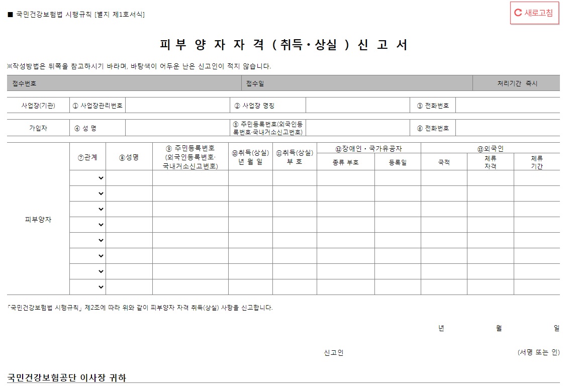 피부양자 등록 방법은 위의 링크를 타고 들어가거나 건강보험공단 사이트를 통해 피부양자 자격 취득 신고서를 다운하여 출력한 뒤 성명, 주민번호, 전화번호 피부양자로 등록될 자의 정보 등을 기입하고